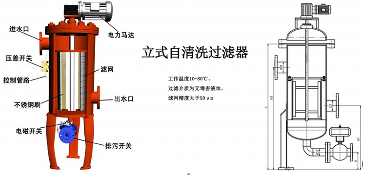 自清洗過濾器是一種利用濾網(wǎng)直接攔截液體中的雜質(zhì) ,漂浮物,顆粒物等,同時降低水的濁度,減少污垢,同時保障后面設(shè)備正常工作及使用壽命的精密設(shè)備,可有效的解決冷卻循環(huán)水系統(tǒng)中的雜志或因結(jié)垢生銹產(chǎn)生固體懸浮物,自清洗過濾器,運行及控制不需外接任何能源就可以自動清洗過濾,自動排污。反沖洗期間不斷流,清洗過濾可以調(diào)節(jié),自清洗過濾時間默認為10-60/s ,清洗過濾損失水量只占過濾水量的0.08 - 0.6% ;過濾精度可達10-3000微米;工作壓力可達1.0-1.6Mpa ;單臺流星: 4-4160m3/h??闪⑹?、臥式、倒置任意方向任意位置安裝。