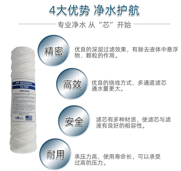 3. 線繞濾芯由不同多種材料制成,確保各種液體過濾要求,達(dá)到較佳過濾效果。